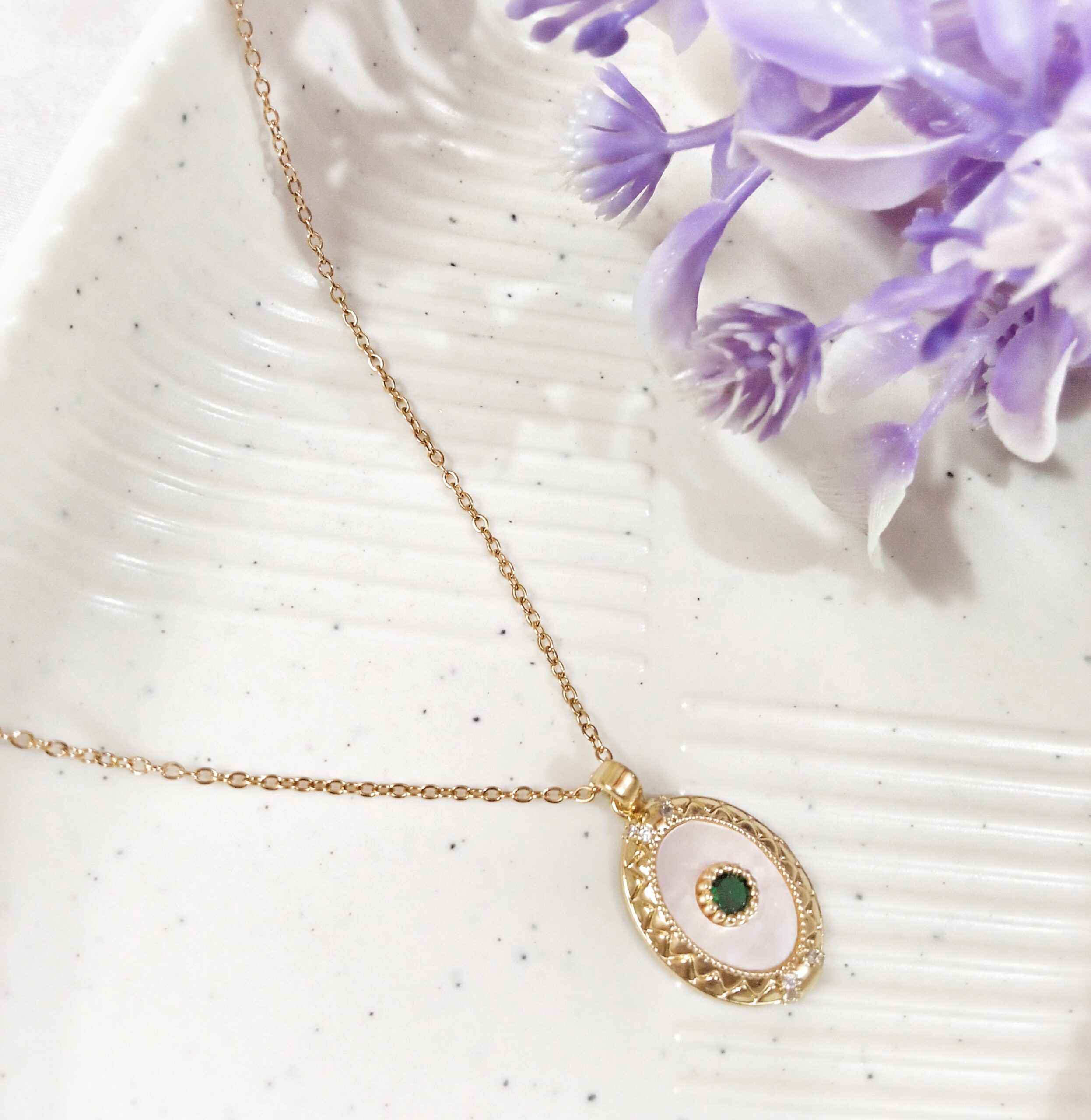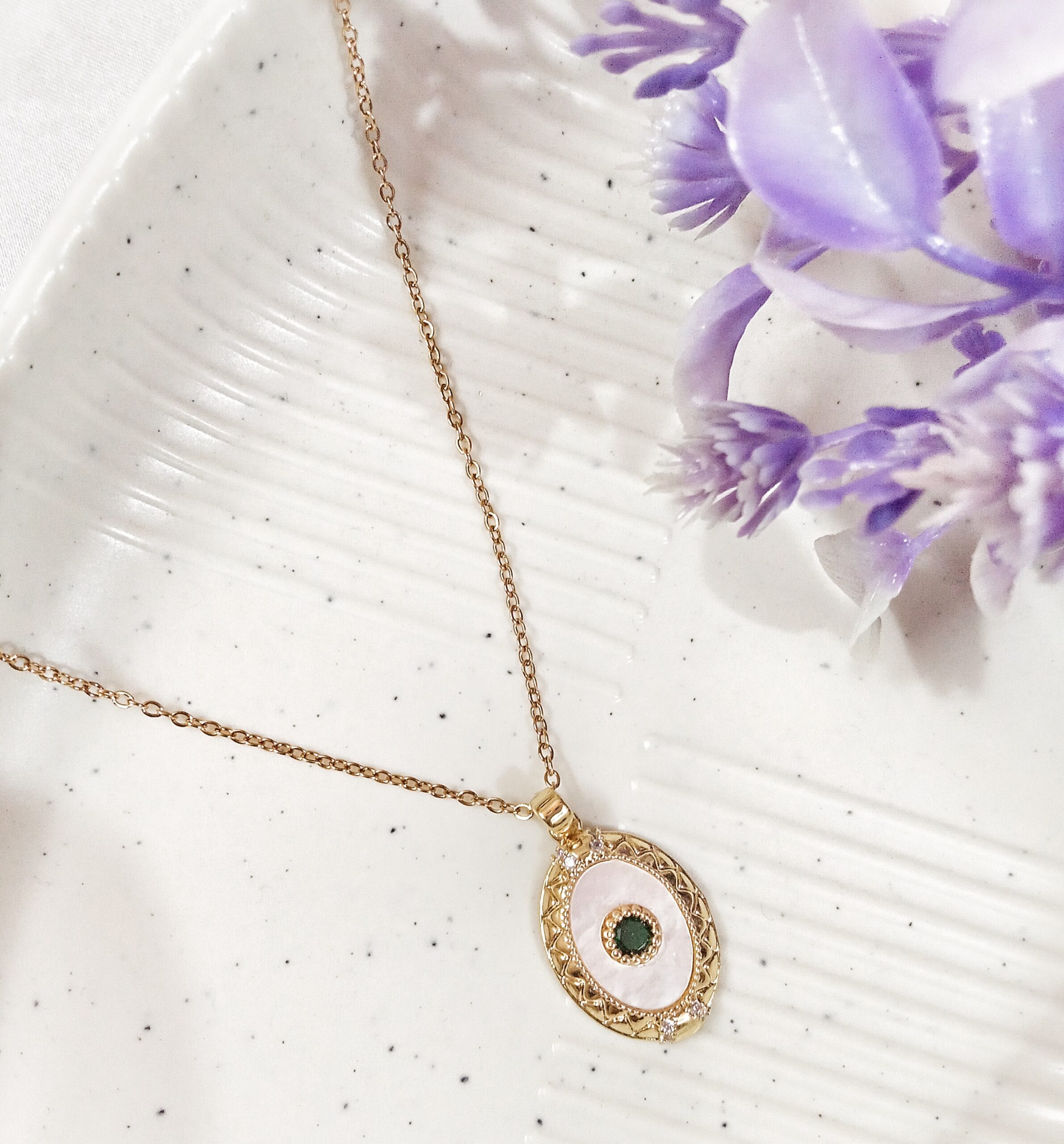 Description: A graceful mother of pearl pendant with a luxe gold frame and a mesmerizing green stone at its heart. A symbol of elegance and serenity, perfect for a timeless look.