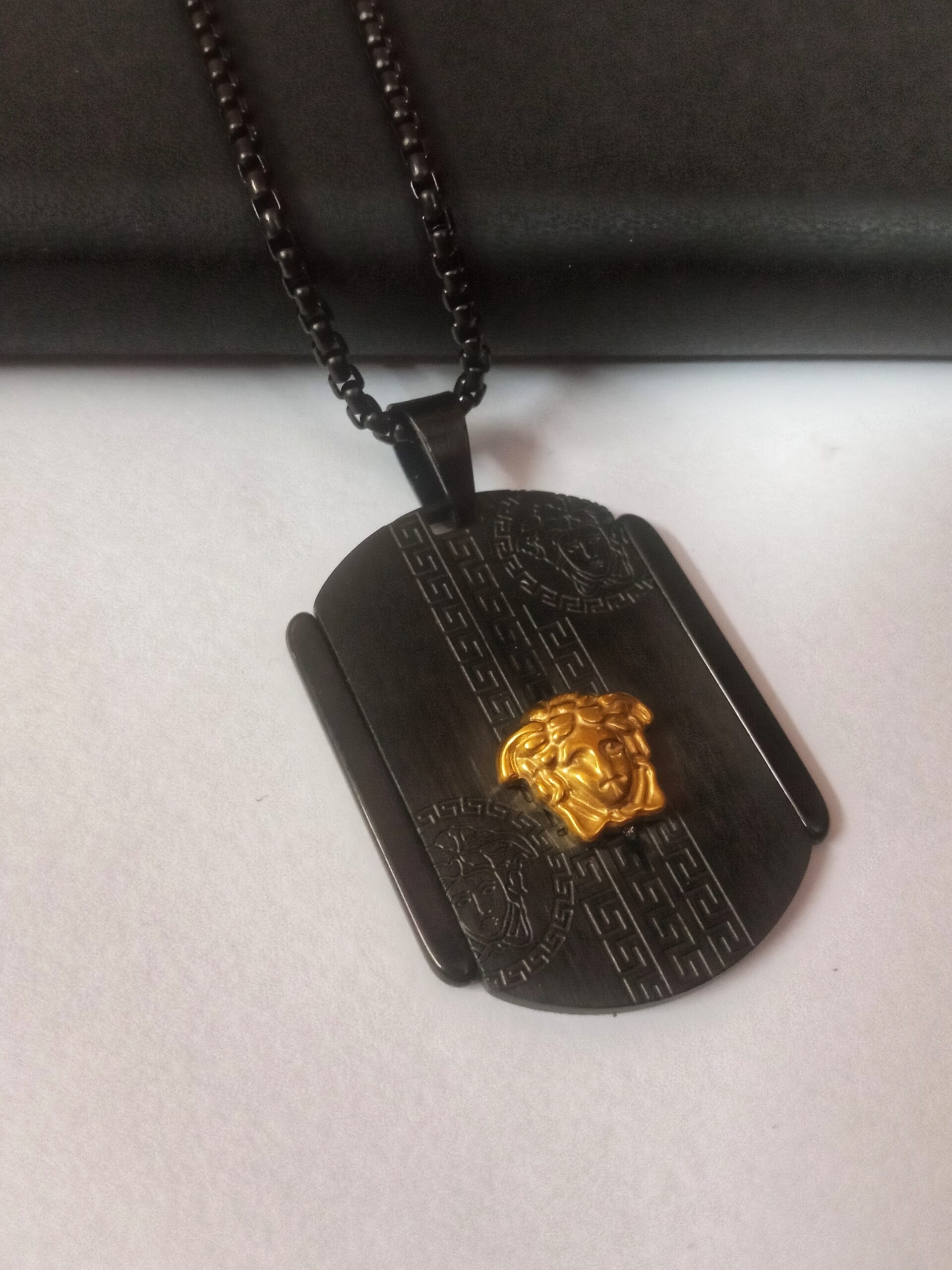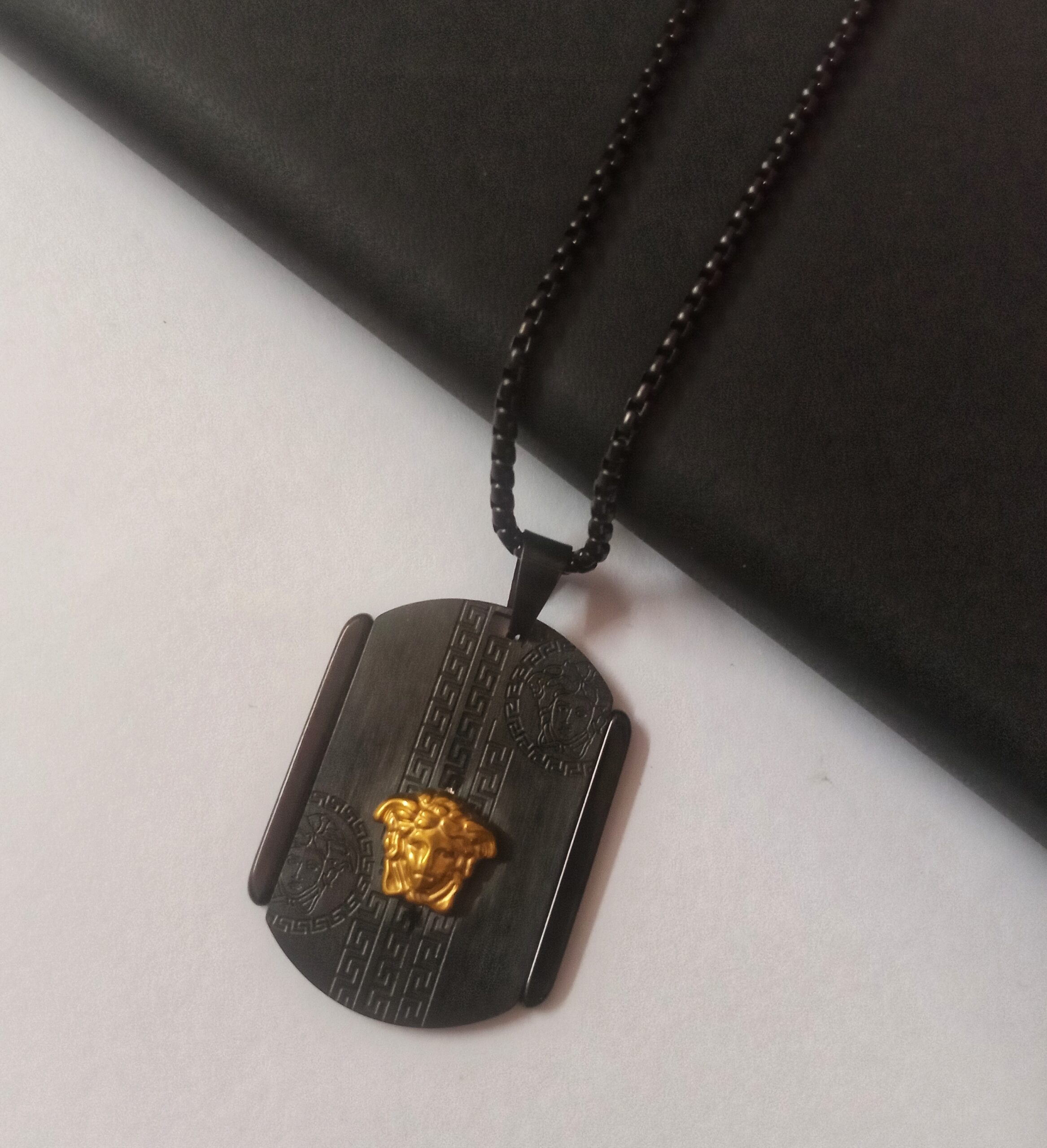 Description: The Titan Crest Pendant is a symbol of strength and luxury. Featuring a bold black-plated base with a striking gold-tone emblem, this piece is crafted for those who command attention and respect.